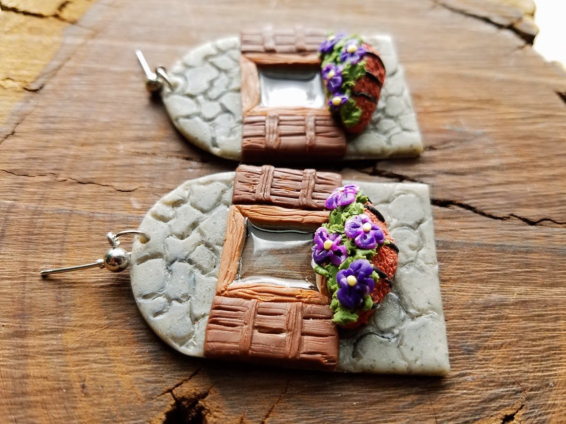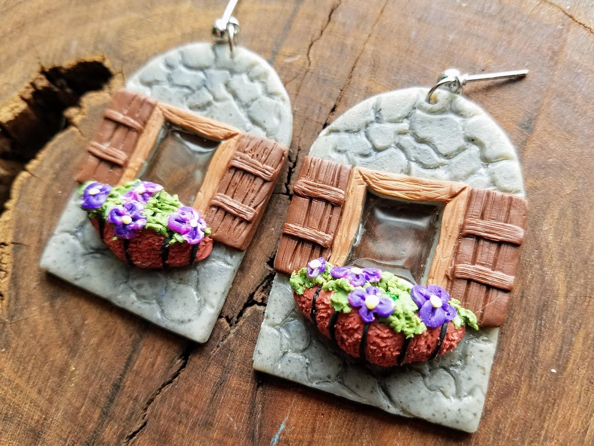 A tiny windowbox for your ears, with resin glass and tiny purple flowers.